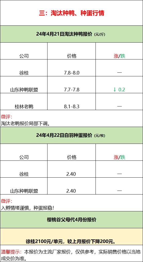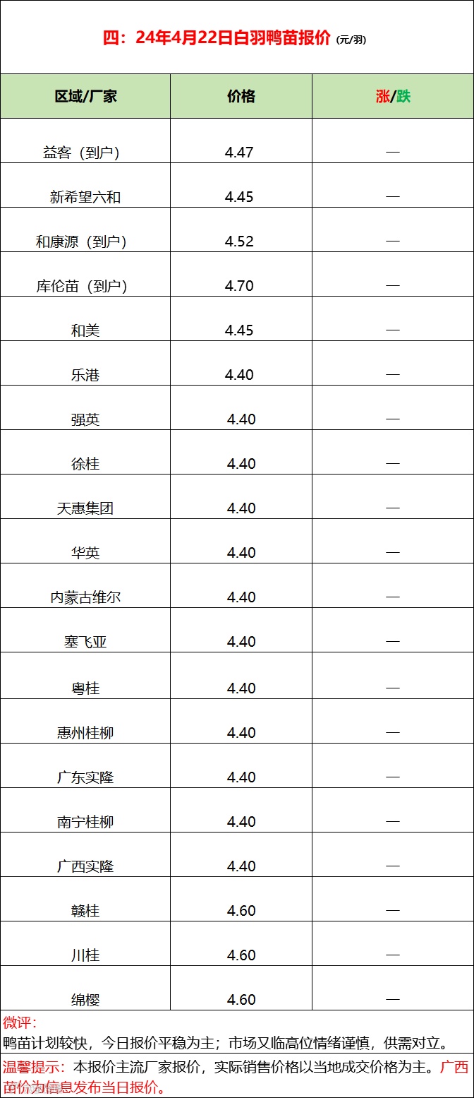 今日樱桃谷鸭苗报价走稳,市场计划较快,鸭苗高位压迫下游补栏情绪谨慎,供需对立加剧。