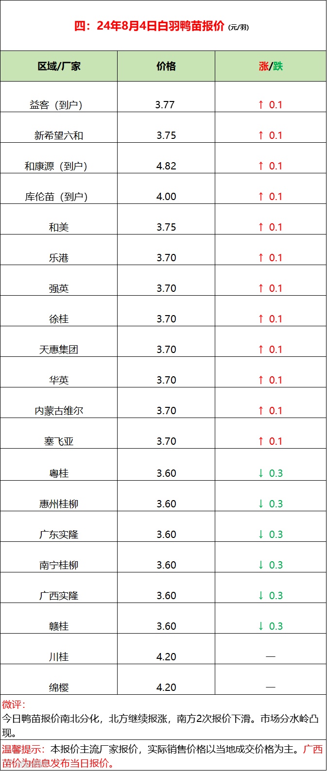 行情分化,北苗上涨,南苗下滑;产品局部上涨;--2024年8月4日水禽行情简报 益牧堂水禽信息