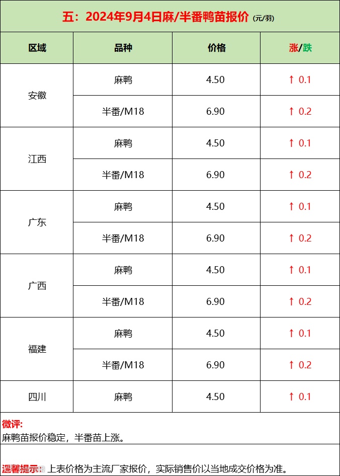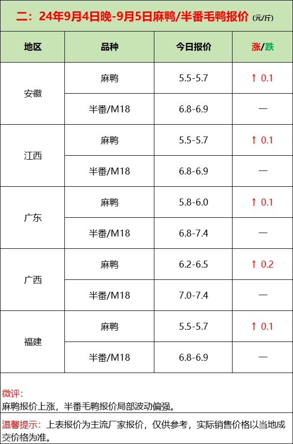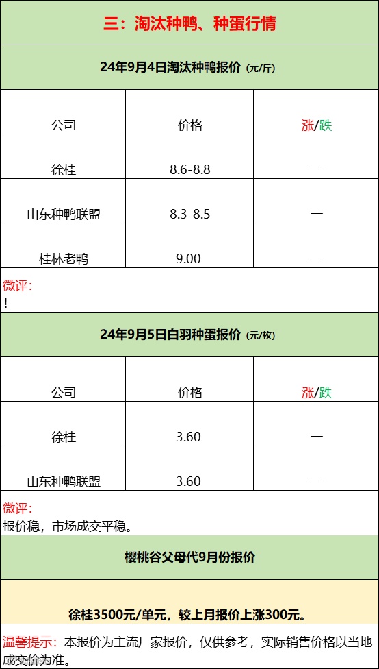 苗蛋平稳,需求不减;产品平淡,走货为主!--2024年9月5日水禽行情简报