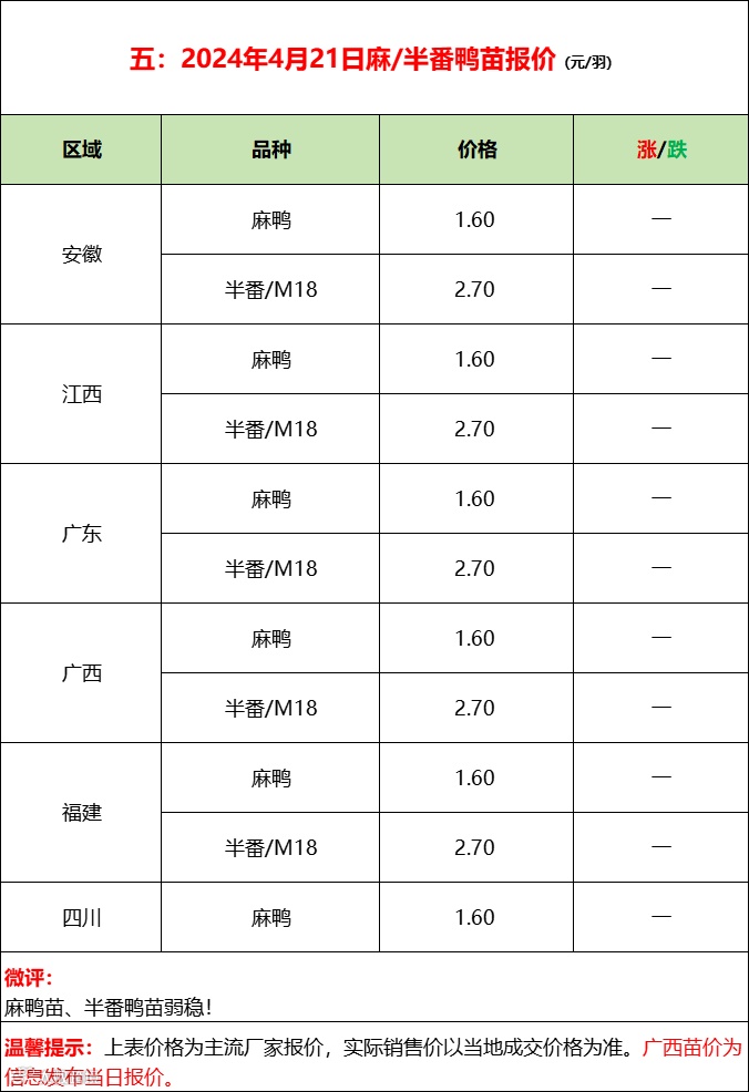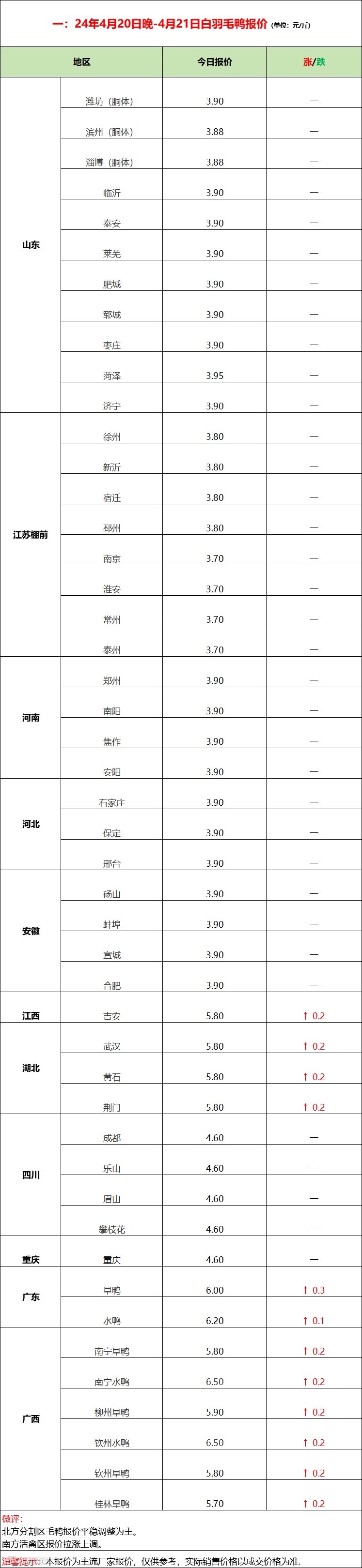 今日北方毛鸭波动调整,冷藏屠宰合同为主,市场交易一般;南方水旱鸭持续拉涨。产品端走货平稳,副产品局部走强,厂家拉涨情绪上升,消费端表现一般。