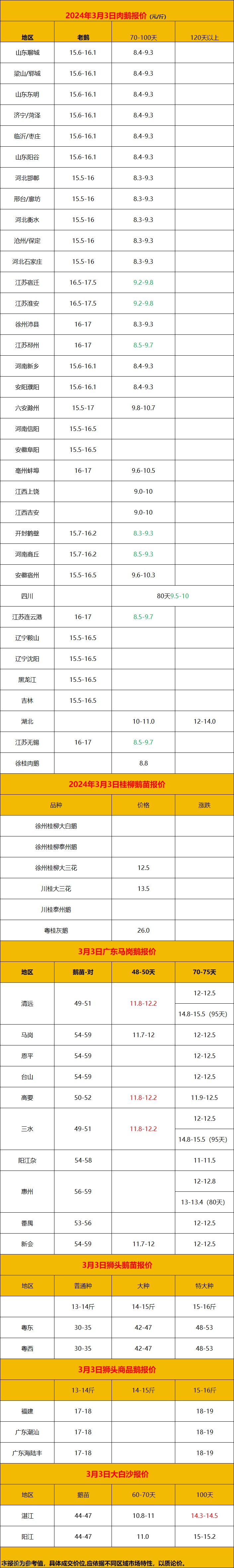廊坊唐山:一年三花种蛋5.1-5.3 泰州-种蛋4.5-4.8
