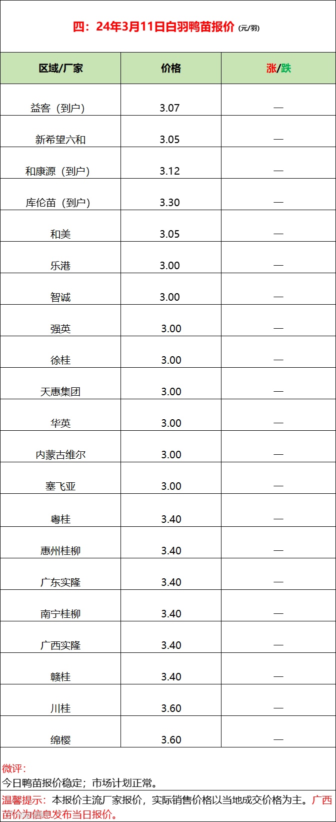 今日鸭苗市场计划正常,报价平稳,市场对峙相持。