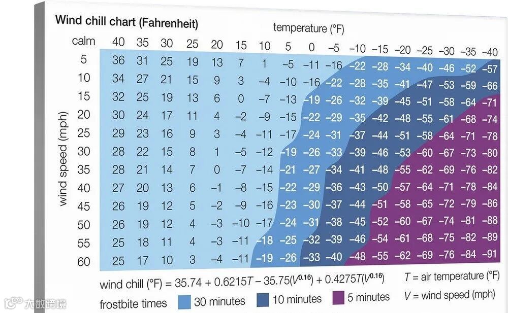 比如,下面的这种公式或图表,可以帮助我们理解风冷,但实用价值不大。