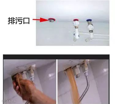 右边蓝色的是冷水进水口,中间红色的热水出水口,左边红色不接水管的就是排污口了。具体操作如下: