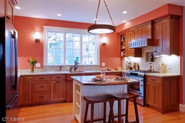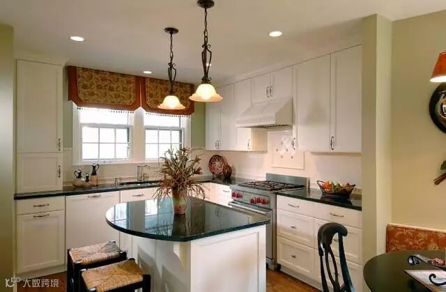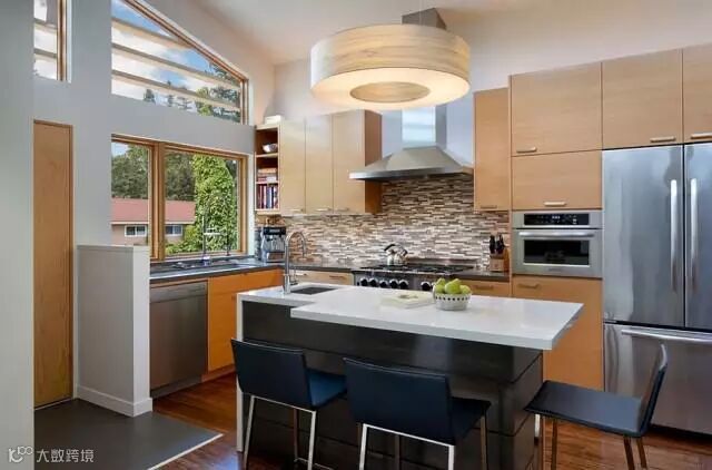 独立岛台厨房设计要求空间相对较大,要容纳下岛台还能有足够操作的空间,岛台是厨房的焦点,一切功用围绕它来展开,构成合理的三角动线。