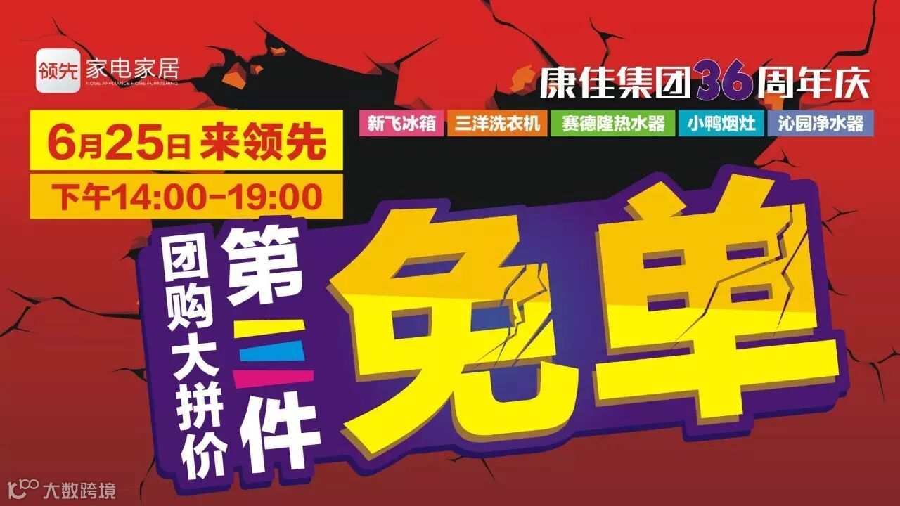 康佳集团于6月25日暨36周年庆典之际举行大型促销活动,为回馈全国广大消费者,特联合新飞冰箱,三洋洗衣机,赛德隆热水器,小鸭烟灶,沁园净水器举行全国万人“团购大拼价”活动。