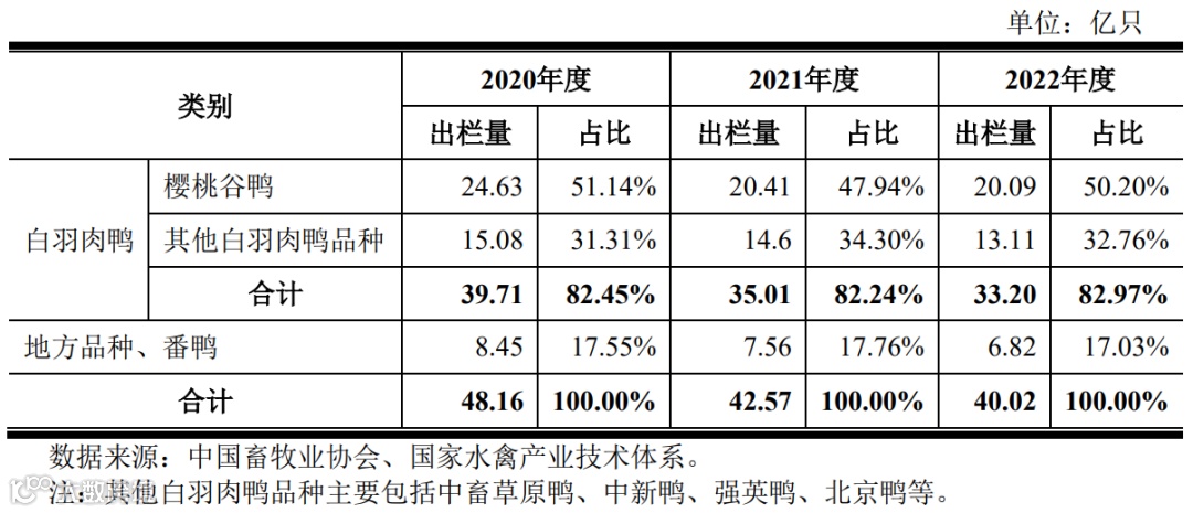 根据中国畜牧业协会出具的《关于樱桃谷鸭在国内白羽肉鸭市场占有率的情况说明》,2019 年、2020年、2021年和2022年,樱桃谷鸭出栏量在白羽肉鸭的占有率分别为 63.05%、62.03%、58.31%和 60.50%,白羽肉鸭占到肉鸭总产量的 80%以上,按照上述测算,公司樱桃谷鸭出栏量占肉鸭总产量的50%左右,占比较高。