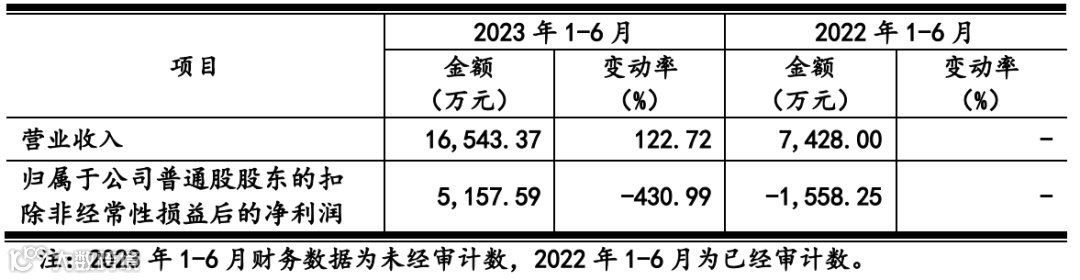 此后,2023年1-6月,公司营业收入、扣除非经常性损益净利润的情况如下: