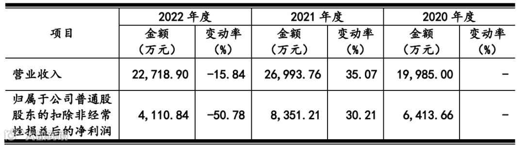 2020年至2022年公司营业收入分别为 19,985.00万元、26,993.76万元和22,718.90万元,2021年营业收入较同期增长35.07%,2022年营业收入较同期下跌15.84%。