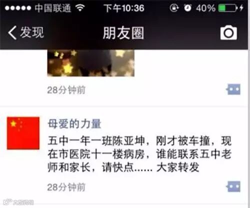 “五中一年一班陈亚坤,刚才被车撞,现在市医院十一楼病房,谁能联系五中老师和家长,请快点……”