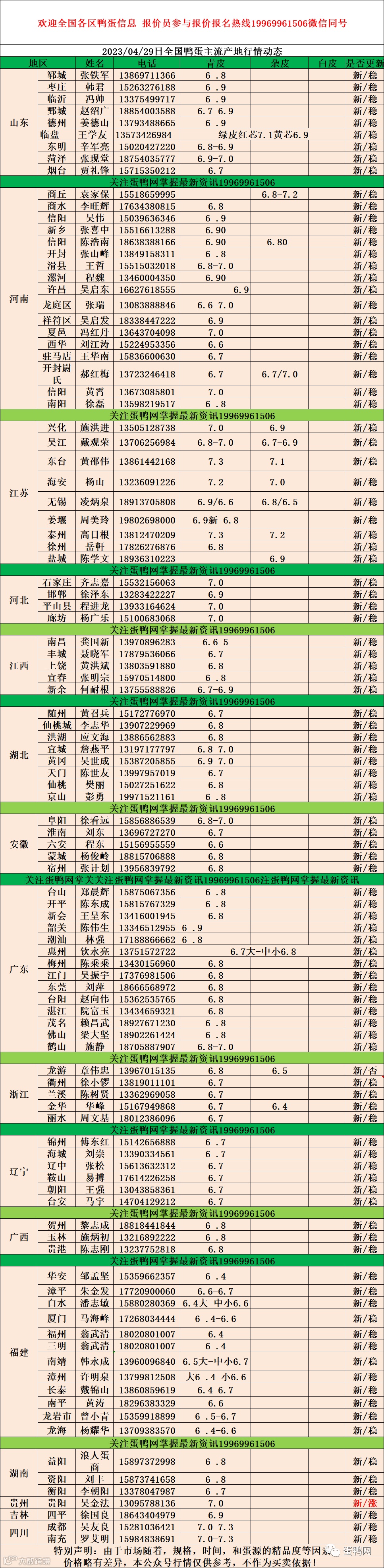 :活禽市场23元/斤左右。屠宰厂收购价18元/斤左右,淘汰鸭价格受毛色,体重,品种等影响的变化较快。
