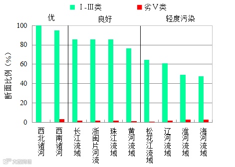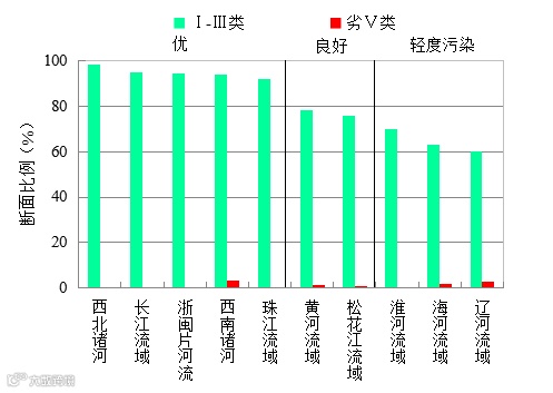 1-6月,长江、黄河、珠江、松花江、淮河、海河、辽河等七大流域及西北诸河、西南诸河和浙闽片河流Ⅰ-Ⅲ类水质断面比例为83.8%,同比上升5.9个百分点;劣Ⅴ类为0.7%,同比下降3.8个百分点。主要污染指标为化学需氧量、高锰酸盐指数和五日生化需氧量。其中,西北诸河、长江流域、浙闽片河流、西南诸河和珠江流域水质为优,黄河和松花江流域水质良好,淮河、海河和辽河流域为轻度污染。