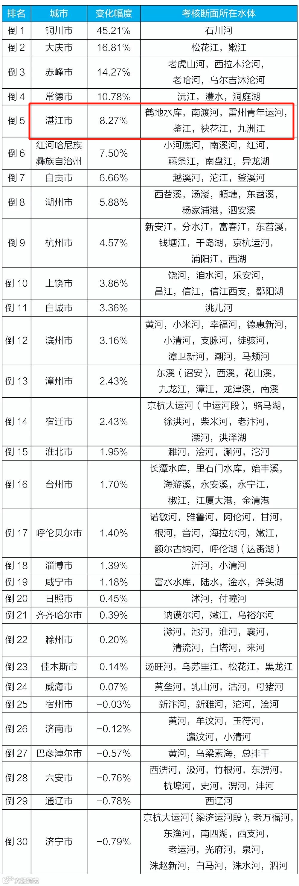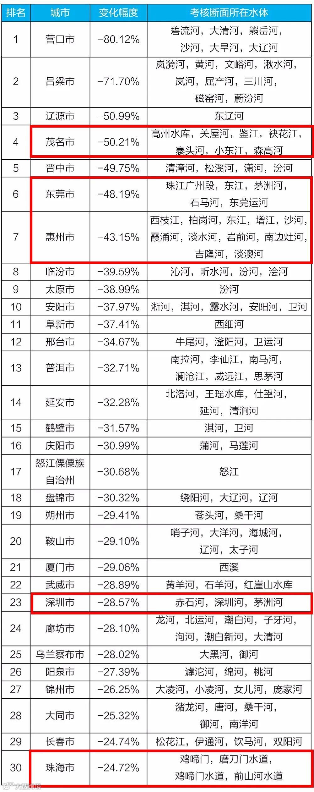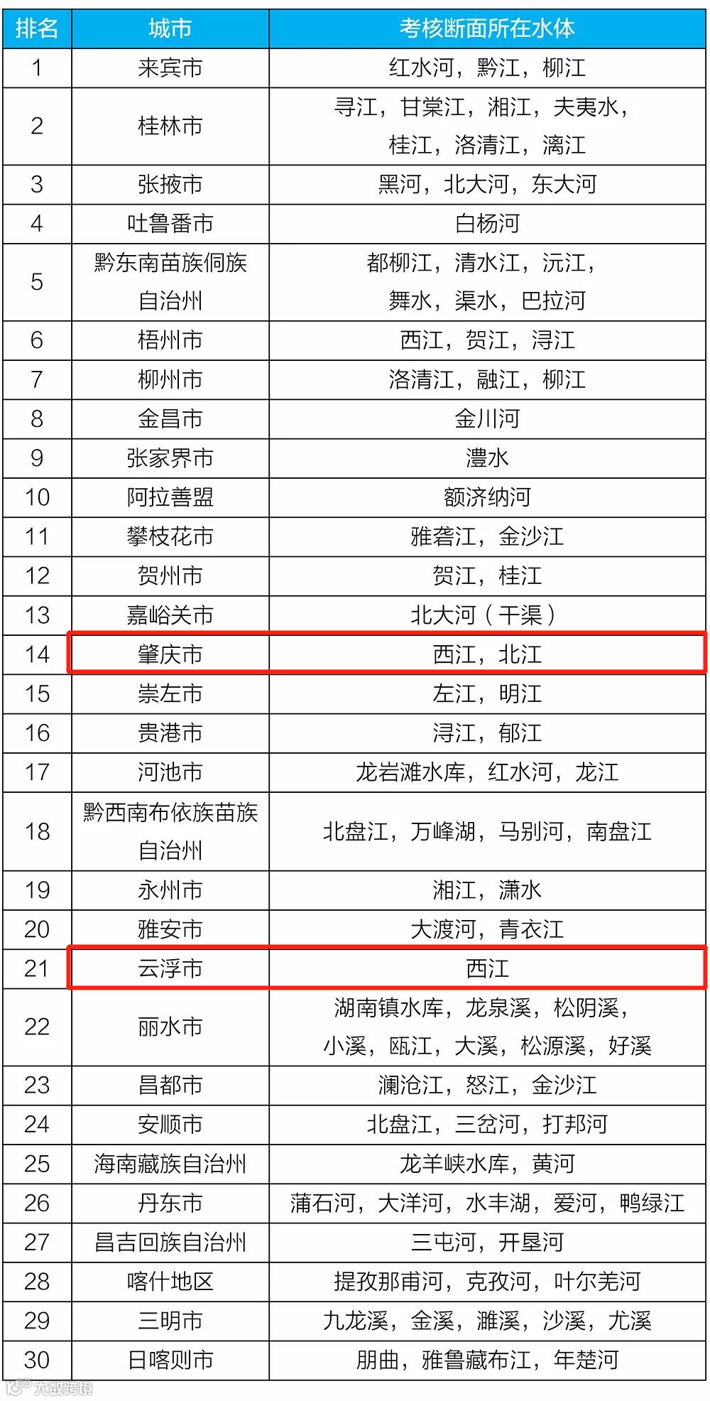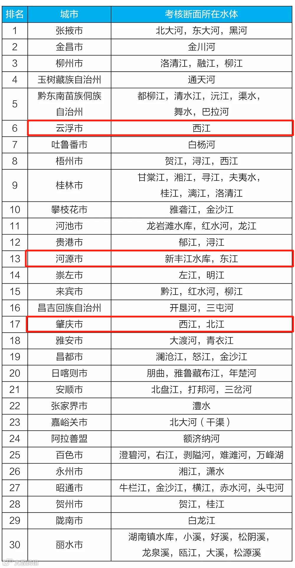 肇庆、云浮进入6月国考断面水环境质量状况排名前30位城市,云浮、河源、肇庆进入1-6月国考断面水环境质量状况排名前30位城市,茂名、东莞、惠州、深圳、珠海进入1-6月国考断面水环境质量改善排名前30位城市。