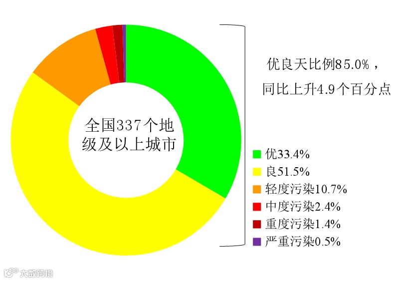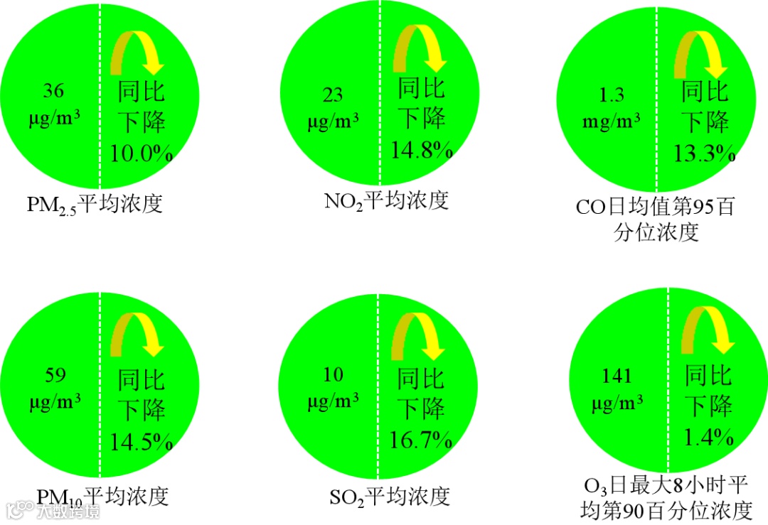 1-6月,全国337个地级及以上城市平均优良天数比例为85.0%,同比上升4.9个百分点;PM2.5浓度为36微克/立方米,同比下降10.0%;PM10浓度为59微克/立方米,同比下降14.5%;O3浓度为141微克/立方米,同比下降1.4%;SO2浓度为10微克/立方米,同比下降16.7%;NO2浓度为23微克/立方米,同比下降14.8%;CO浓度为1.3毫克/立方米,同比下降13.3%。