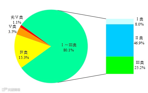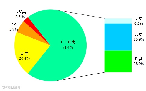 6月,1940个国家地表水考核断面中,水质优良(Ⅰ-Ⅲ类)断面比例为71.4%,同比上升0.6个百分点;劣Ⅴ类断面比例为2.5%,同比下降2.9个百分点。主要污染指标为化学需氧量、高锰酸盐指数和总磷。