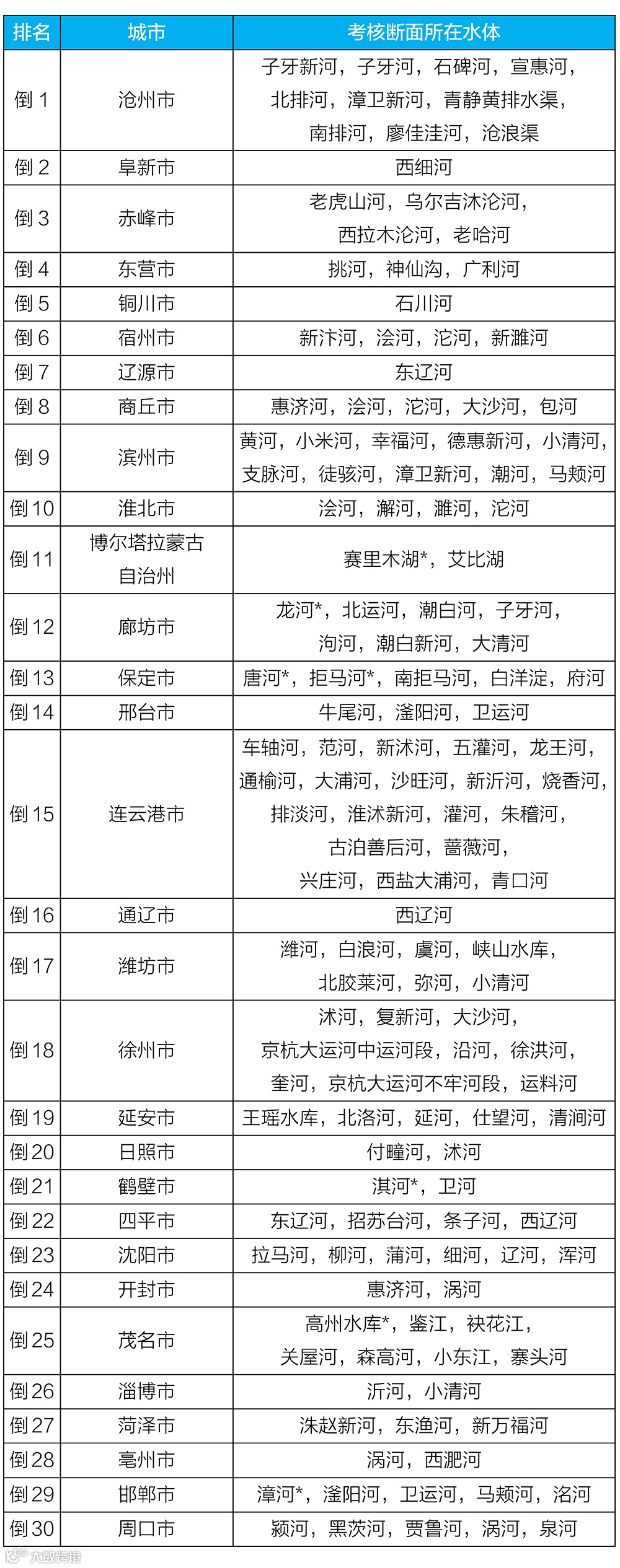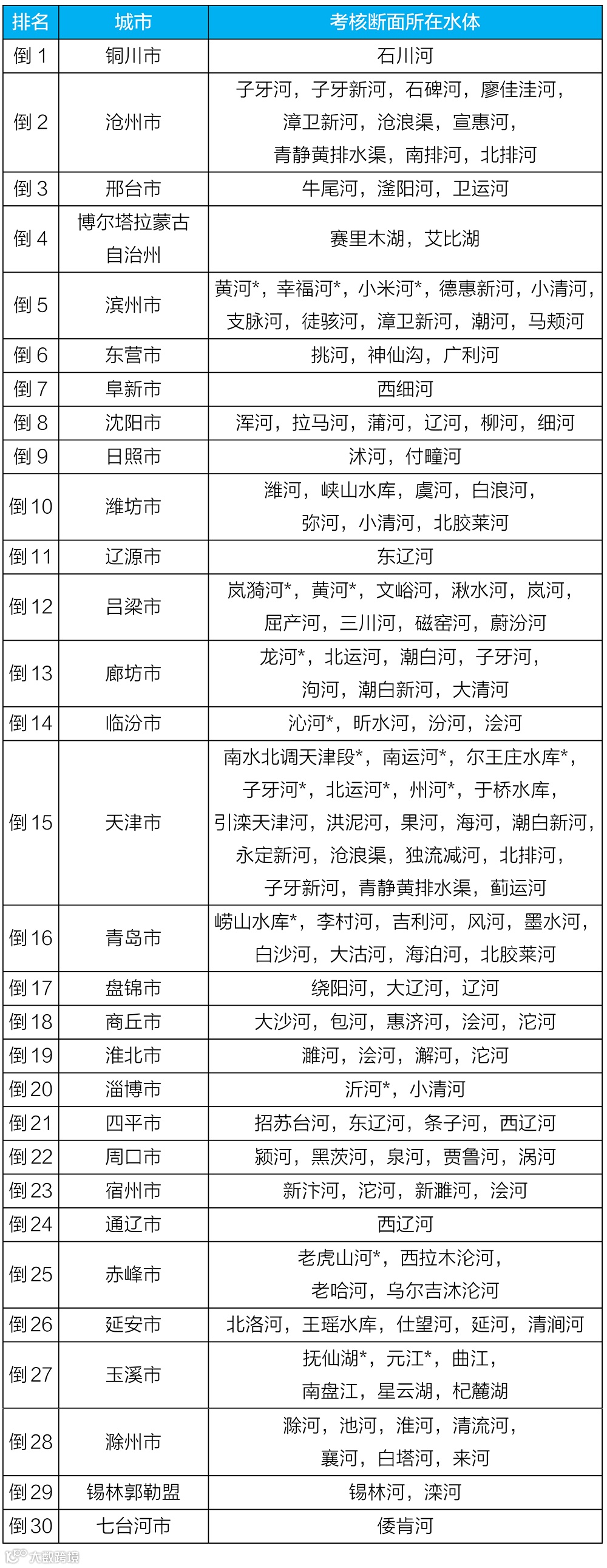 参加排名的全国地级及以上城市,覆盖2050个国控断面(其中1940个为国家地表水考核断面,110个为入海控制断面)。6月,全国地级及以上城市中,来宾、桂林和张掖等30个城市国家地表水考核断面水环境质量相对较好(从第1名至第30名),沧州、阜新和赤峰等30个城市国家地表水考核断面水环境质量相对较差(从倒数第1名至倒数第30名);1-6月,全国地级及以上城市中,张掖、金昌和柳州等30个城市国家地表水考核断面水环境质量相对较好(从第1名至第30名),铜川、沧州和邢台等30个城市国家地表水考核断面水环境质量相对较差(从倒数第1名至倒数第30名);营口、吕梁和辽源等30个城市国家地表水考核断面水环境质量变化情况相对较好(从第1名至第30名),铜川、大庆和赤峰等30个城市国家地表水考核断面水环境质量变化情况相对较差(从倒数第1名至倒数第30名)。详细见附表1~附表6。