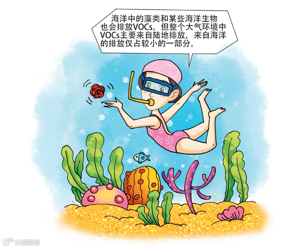 海洋中的藻类和某些海洋生物也会排放VOCs。但整个大气环境中VOCs主要来自陆地排放,来自海洋的排放仅占较小的一部分。而且海上空气较为洁净,NOx含量很低,所以生成的O3量很少。同时由于海洋人口密度非常低,所以对人产生的影响也非常少。