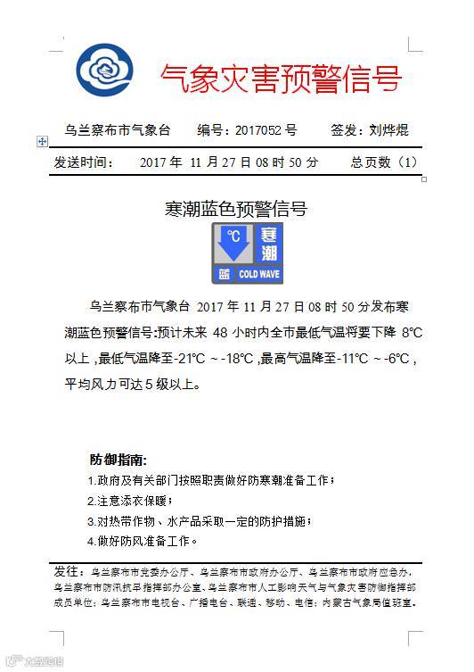 预计从27日夜间气温开始下降,最低气温降幅达8℃左右,最高气温降幅达10℃左右,全市大部地区都将出现寒潮天气;28日白天最高气温在-11~-3℃,29日早晨气温降至最低,最低气温在-17~-22℃。 27日白天全市风力增大,4-5级偏西风,阵风可达5-6级。
