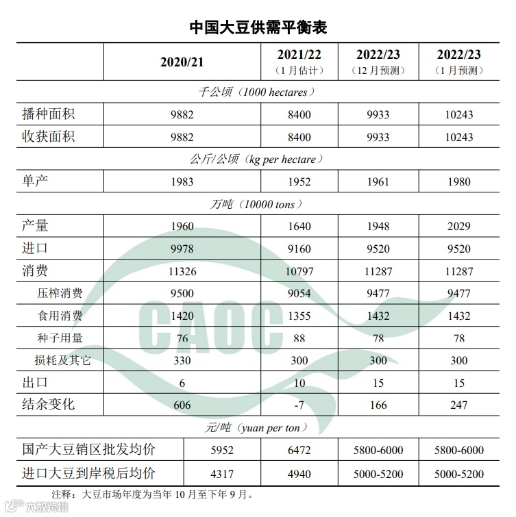 根据国家统计局公告,2022年,中国大豆播种面积10243千公顷,比上年度增加1843千公顷,增长21.7%;全国平均单产每公顷1980公斤,比上年度增加28公斤,增幅1.7%;大豆总产量2029万吨,比上年度增加389万吨,增幅23.7%。本月对2022/23年度中国大豆面积、单产和产量进行相应调整,其他预测与上月保持一致。