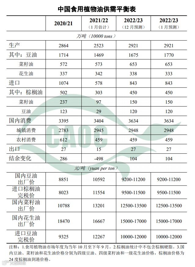 本月预测,2022/23年度中国食用植物油产量、进口量、消费量均与上月预测值保持不变。其中,豆油和花生油产量结构略有调整。春节期间食用植物油供给总体有保障。油菜主产区大部处于移栽后成活至现蕾期,局部进入抽薹期,气象条件总体有利于油菜生长,后期仍需关注雨雪低温天气对油菜生产的影响。