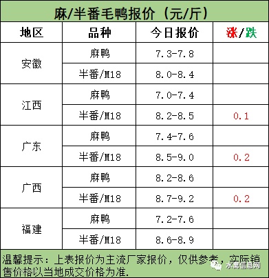 麻鸭苗报价弱稳;半番鸭苗报价弱稳。