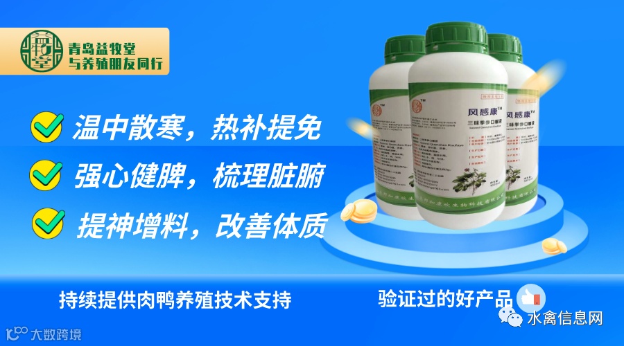 风感康药性温补,清热不下泄,抗病毒不影响免疫;对免疫器官、脏腑发育不完善的雏鸭友好。具有祛风散寒,强心健脾,清热抗病毒的功效。用于风寒感冒、温和性流感、多重应激激发的甩鼻咳嗽、流清鼻涕、发烧缩脖、腹泻抽搐等症状的防治。对弱苗,久病体虚,采食量低下鸭群有较好的调节改善效果。