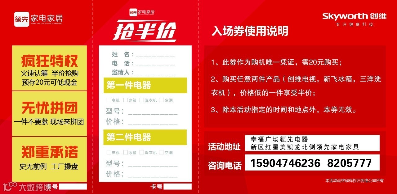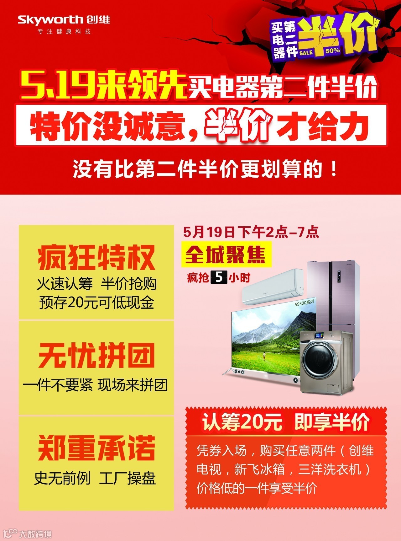 5月19号下午2点领先约你来参加创维、新飞、三洋举办的买电器第二件产品半价优惠活动,现场可以自由搭配任意组合,也可以拼单,凭邀请函购机再降20元,工厂操盘,仅此一天!