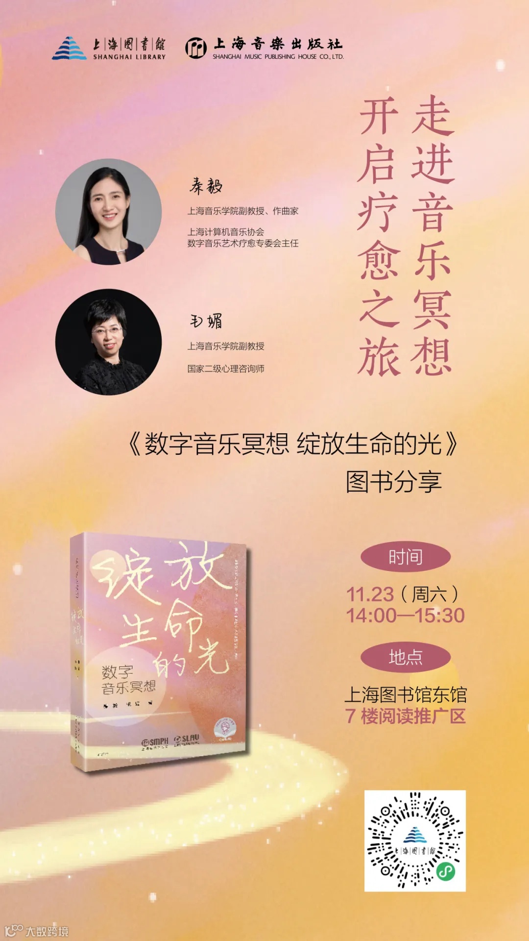 11月23日(周六)下午,图书的两位作者,上海音乐学院音乐工程专家秦毅副教授与教育心理专家毛媚副教授将来到上图东馆7楼,带来一种全新的自我疗愈和心灵成长的途径,实现身心的放松和精神的净化。