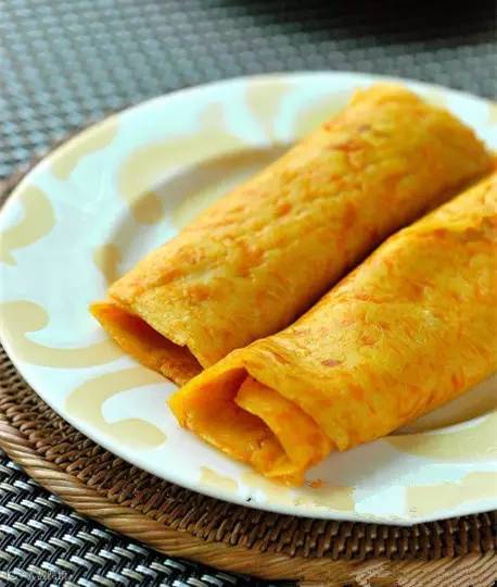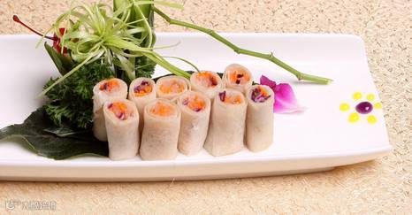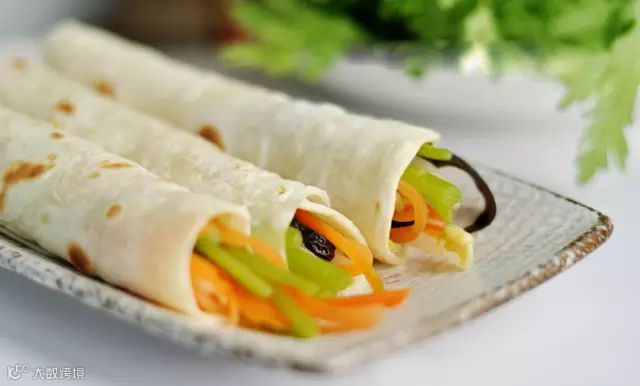 3、食用时,将薄饼皮摊开,铺入适量干海苔、香菜、肉松、花生酥、蒜白丝,抹上辣椒酱,再抹上薄饼馅料,包卷成圆筒形长条即可。