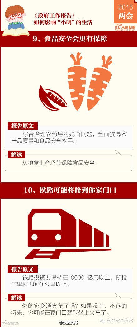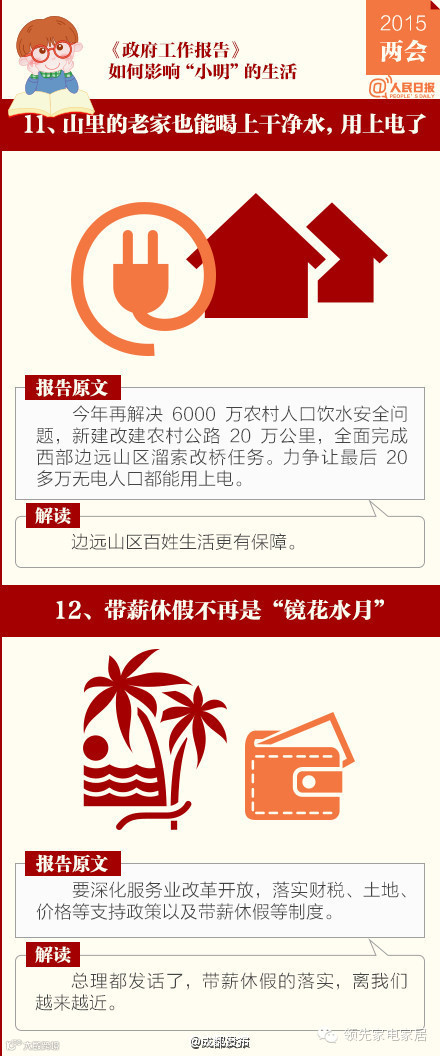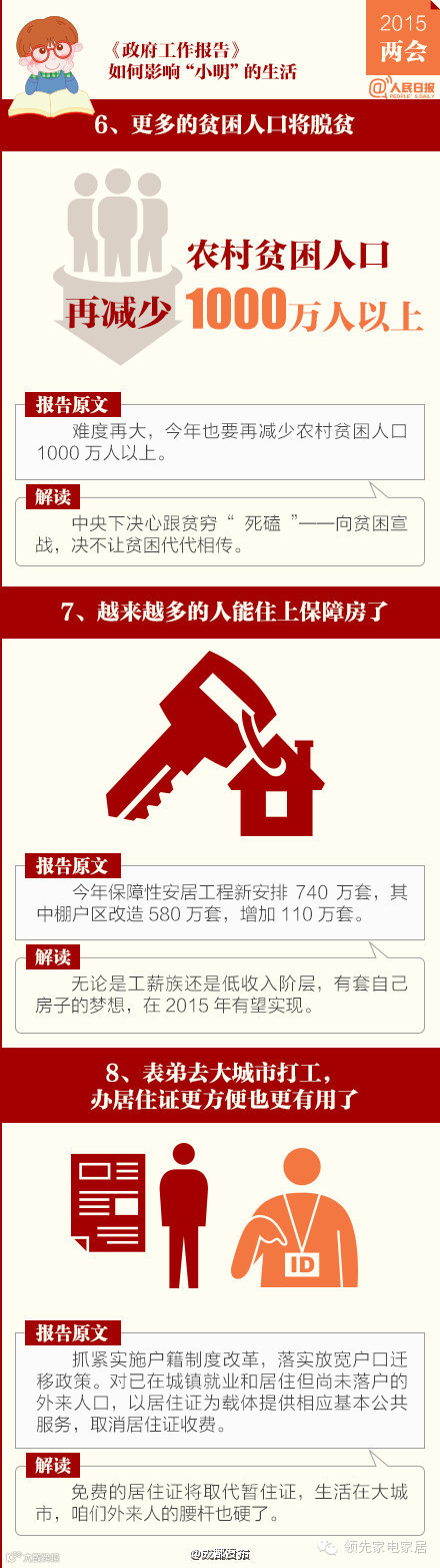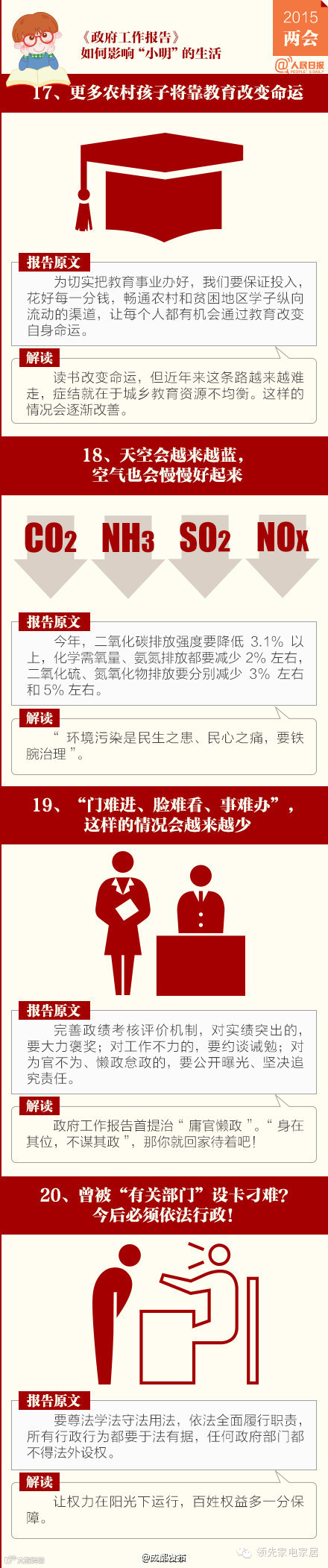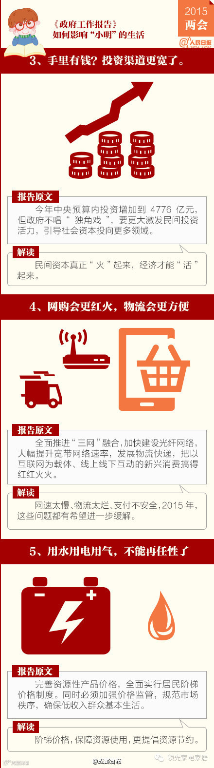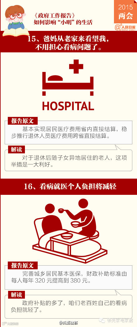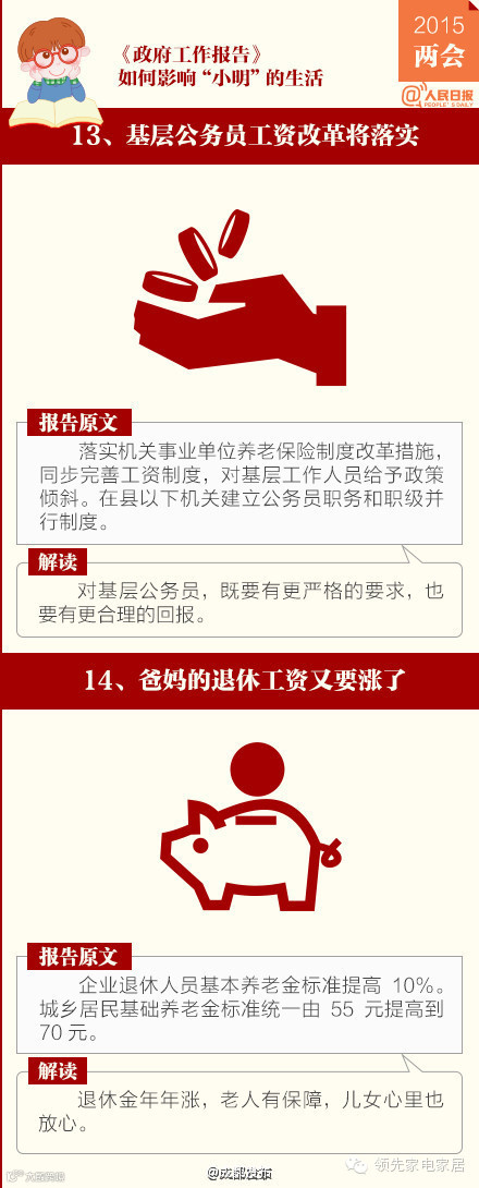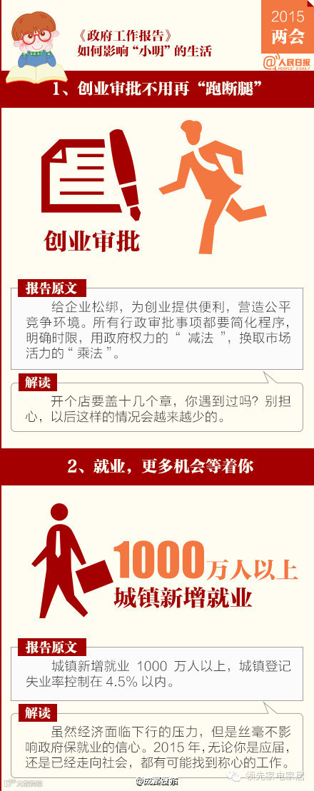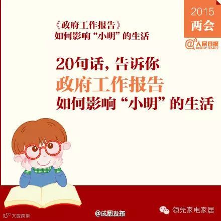 20句话,告诉你2015政府工作报告如何影响“小明”的生活①创业审批不用再“跑断腿”;②爸妈的退休工资又要涨了;③网购会更红火,物流会更方便;④用水用电用气,不能再任性了;⑤办居住证更方便也更有用了。经济、社保、医疗、就业……更多变化猛戳大图,政治承诺,与你我生活息息相关!