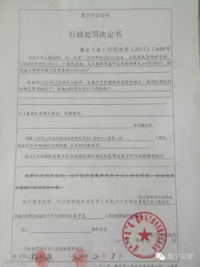 2015年12月8日14时许,一位61岁的大妈在集宁区民建路与光明街路口,因闯红灯被交警拦下,后不服从劝导并用手包击打交警,影响交警正常执法,现根据《中华人民共和国治安管理处罚法》第四十三条第一款之规定,给予该大妈行政拘留五日的处罚。