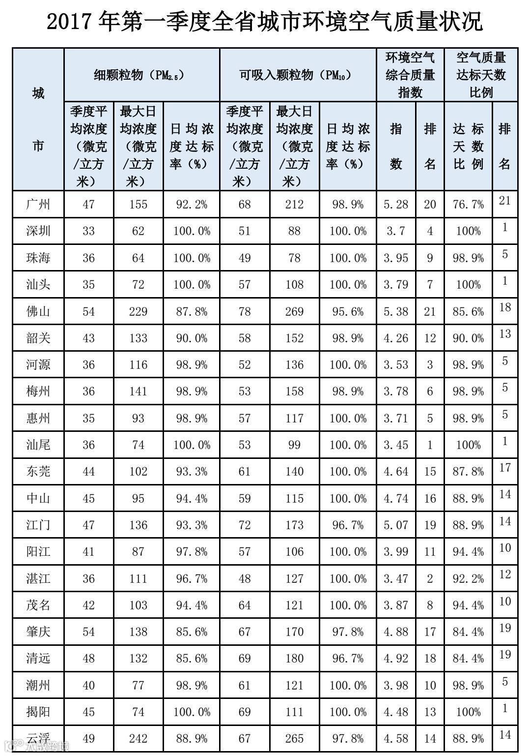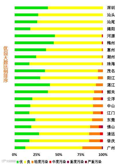 根据环境空气质量综合指数排名,我省各地级以上市排名依次为:汕尾、湛江、河源、深圳、惠州、梅州、汕头、茂名、珠海、潮州、阳江、韶关、揭阳、云浮、东莞、中山、肇庆、清远、江门、广州、佛山。