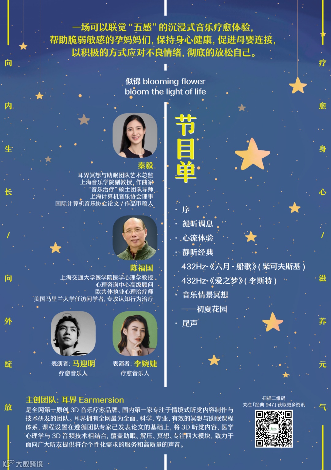 感谢经典947,感谢各位准妈妈们的参与,耳界Earmersion会一直为各位妈妈和准妈妈们提供减压放松的疗愈音乐,帮助改善孕期以及育后的焦虑、抑郁问题。