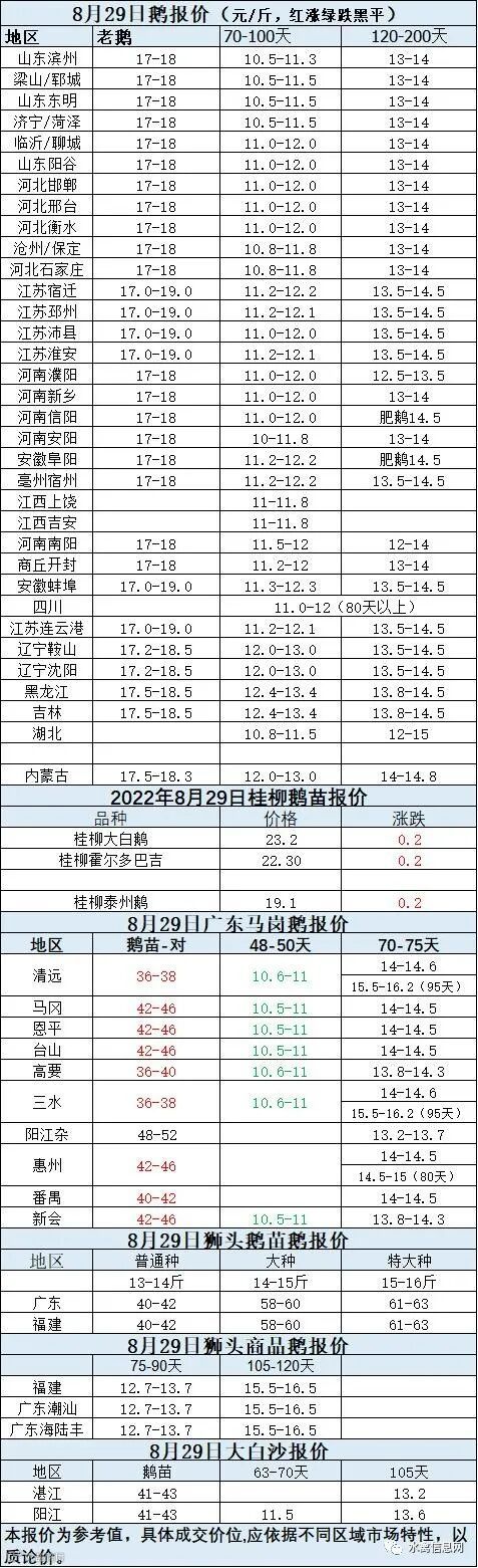 2022年8月29日鹅种蛋价格(元/枚)部分停报