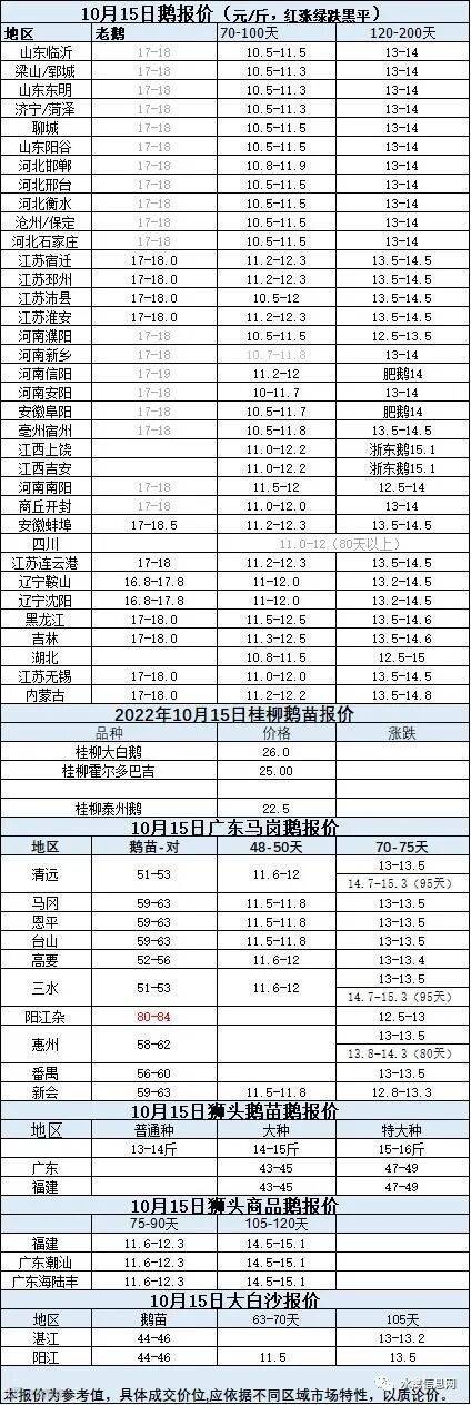 2022年10月15日各品种鹅苗价格
