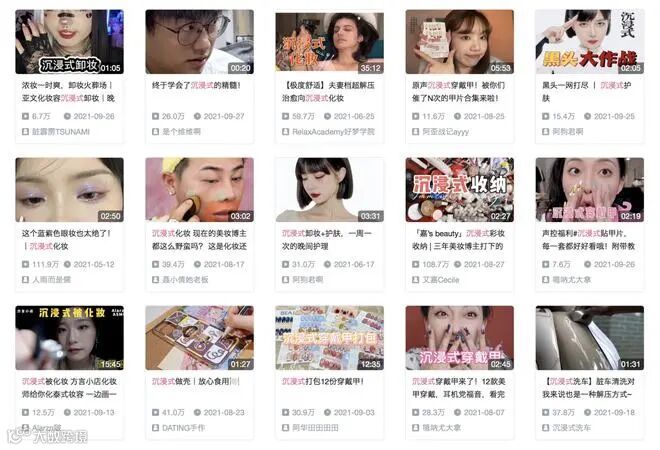在这些视频里,没有BGM,没有人的说话声音,观众们只能看到和听到博主正在做的这件事情,如开瓶盖、敲击、倒水的画面和声音。这种看似简单的视频,在各大短视频平台均获得很多人的关注。在抖音上,“沉浸式化妆”的话题播放量甚至高达30亿次。