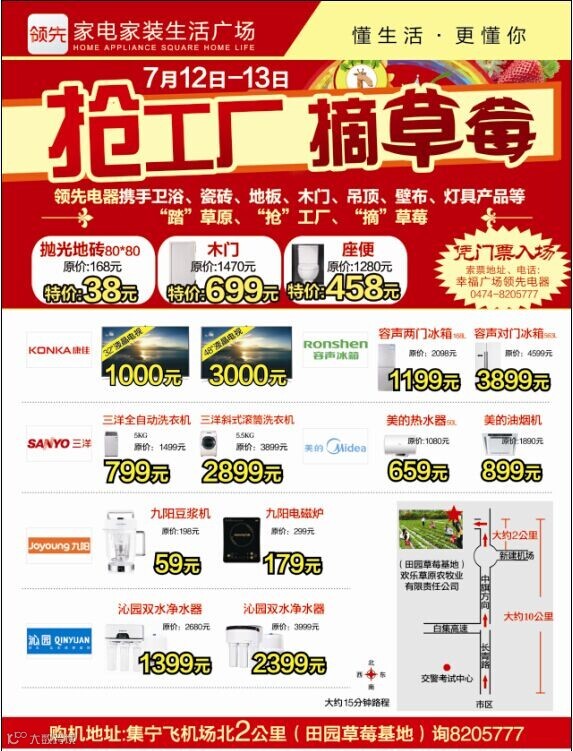 顾客凭“工厂门票”乘坐“免费大巴”到草莓田园基地参加“领先厂家工厂直销”活动,购家电家装产品免费获得“摘草莓”机会!