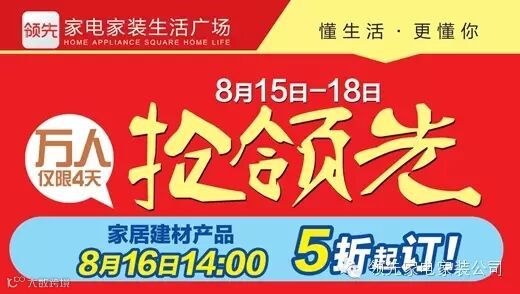 顾客在8月16日(下午14:30)预定家装各品牌产品,顾客预交1000元订金,现场预定家装各品牌工厂直销价政策,顾客凭家装订单票及家装邀请卡由家装总经理现场签送1000元家电补贴基金,相当于“0”元预定,资源有限,先定先送!