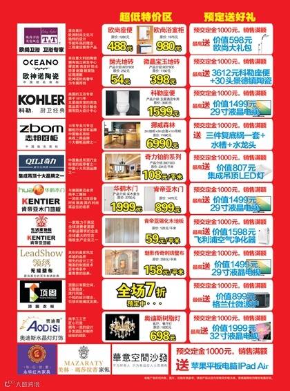 顾客在6月15日预订家装产品,顾客转销满消费金额 送坐便、送飞利浦净化器、送冷藏冷柜、送液晶电视等。