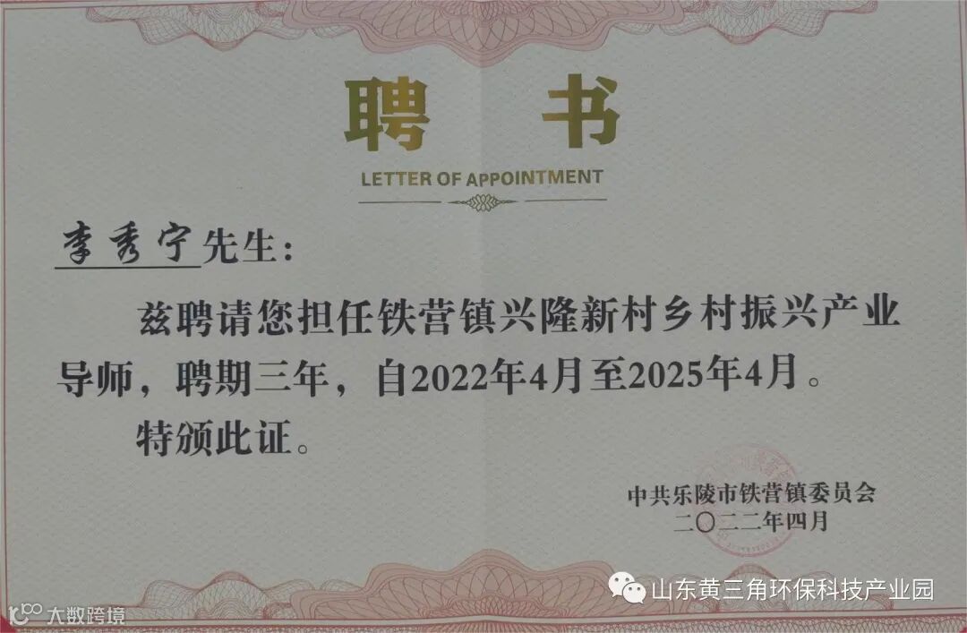 8月14日上午,我公司董事长李秀宁接受铁营镇的邀请,于兴隆花园党群服务中心参加“铁营镇乡村振兴产业导师’聘任仪式’”,由兴隆管区书记刘勇颁发聘书。兴隆新村各党委书记宋焕强和自然村党支部书记参会,由铁营镇团委书记王雪主持会议。