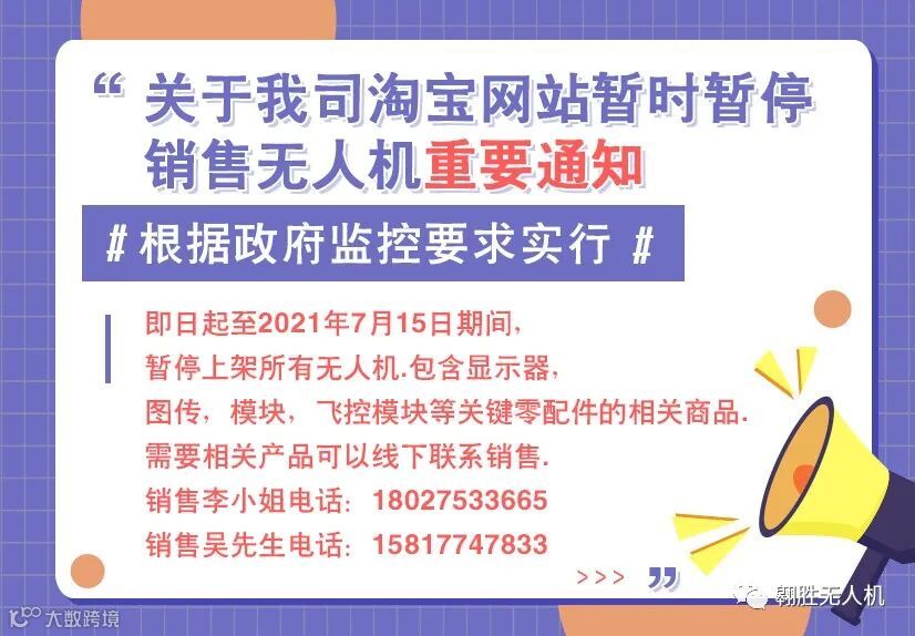 各位尊敬的新老客户,即日起我司淘宝网站所有无人机,以及无人机相关产品已经下架,至7月15日另等通知.再明确上架时间.