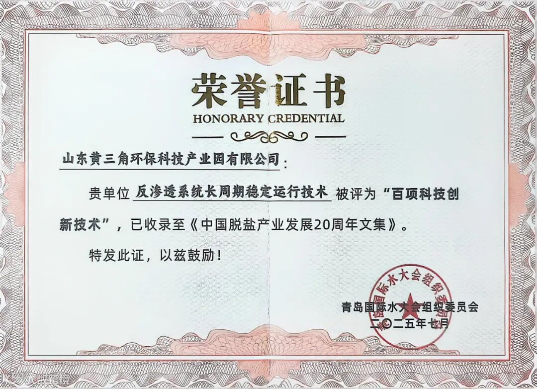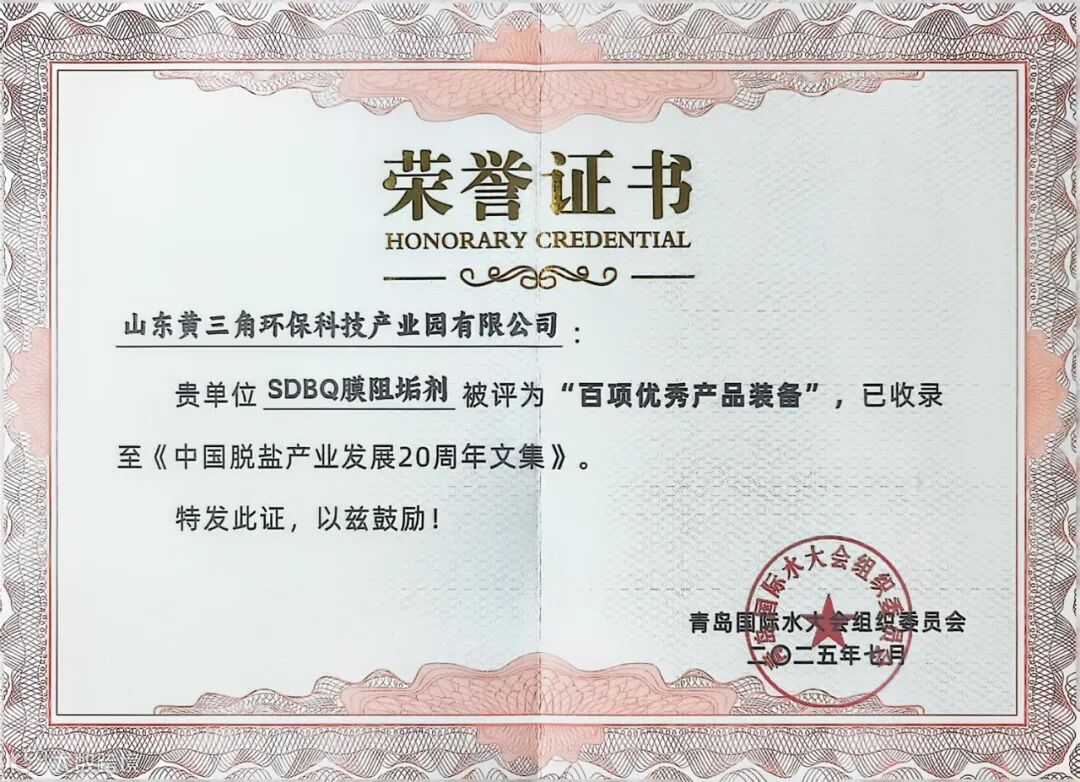 在刚刚落幕的第20届青岛国际水大会上,山东黄三角环保科技产业园有限公司凭借在水处理领域的卓越创新成果,一举斩获两项重量级荣誉!公司自主研发的 “SDBQ膜阻垢剂” 和 “反渗透系统长期周期稳定运行技术” ,分别被大会组织委员会授予 “百项优秀产品装备” 和 “百项科技创新技术” 荣誉称号,并双双被权威收录至《中国脱盐产业发展20周年文集》!