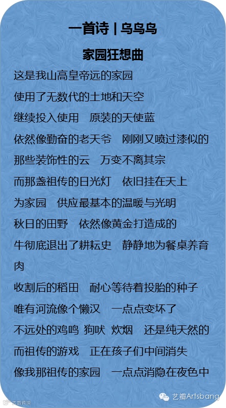 然而,眼前的这首《家园狂想曲》,却非常写实。但又为何称为“狂想曲”呢?因为“家园”已不再是从前那个家园了,一切只存在于幻想和思念中。乡愁,便是这首诗的主旨——乡愁这个词,在当下已被炒作得泛滥,但这并不妨碍有着乡村生活经验的我们,从诗中得到共鸣。