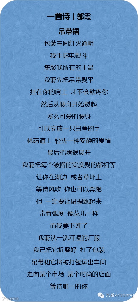 “包装车间灯火通明,我手握电熨斗,聚集我所有的手温。”听她念着,我在电脑这边想她的故事:下班之后,坐在电脑前,她用诗歌自由书写内心。在面对诗歌的时候,她不是组成2.7亿农民工群体的一个数字,而是她自己,是邬霞,是不断走向自我灵魂的女诗人。