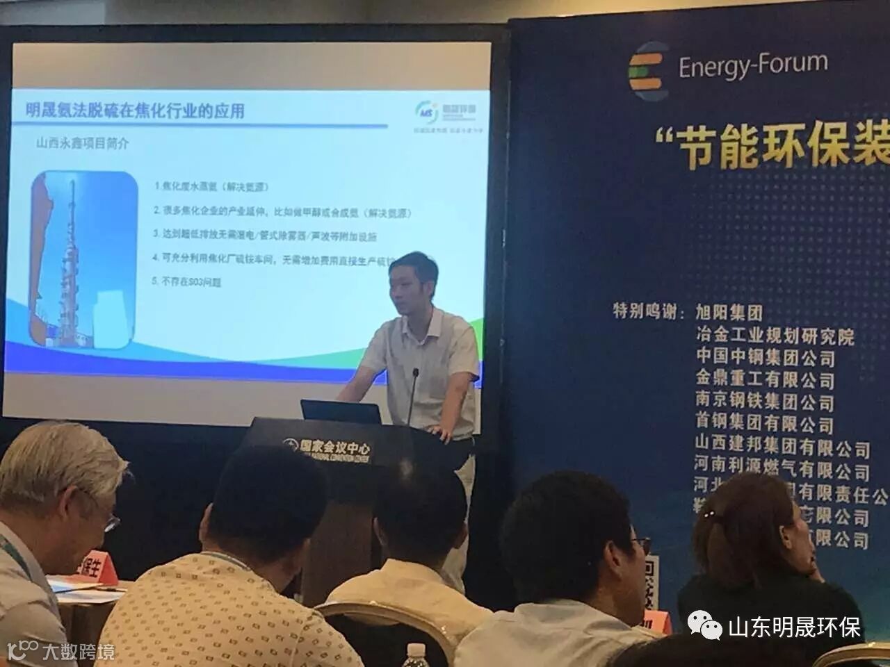 此次会议,山东明晟化工工程有限公司总经理张泽华先生为众多企业带来了一项绿色可循环的环保技术----“梯级分离净化氨法脱硫除尘一体化技术”,该项技术经过了由中国工程院郝吉明院士、中国工业环保促进会会长杨朝飞等专家组成的鉴定委员会的成果鉴定,经鉴定该技术达到了国际先进水平。该技术工艺设备紧凑,占地面积小,一次性投资低,无二次污染,副产品硫酸铵可资源化利用,实现了二氧化硫和烟尘的超低排放。