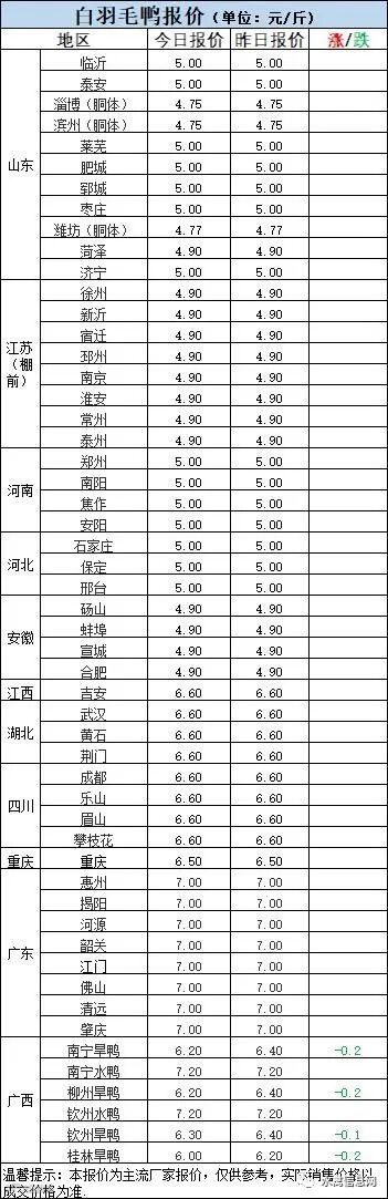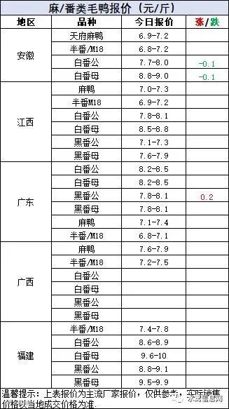 麻鸭苗报价稳定为主,部分地区上调0.1元/羽;半番鸭苗报价上调0.1元/羽;黑白番局部下行调整。