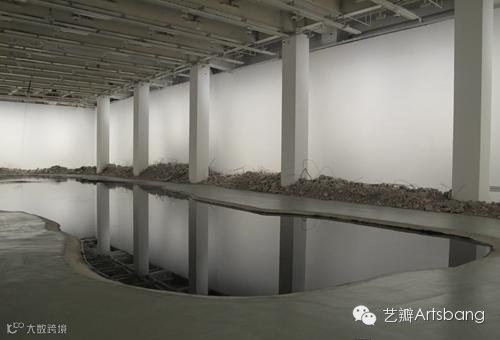 ”这个展厅里,你们所看到的水泥块和钢筋,是从展厅地板里挖出来的。它看起来像个池塘,里面灌着几十吨的墨,大家可以闻到墨香,墨和中国传统文化息息相关。另外,这个水泥地块本身又像是中国现代的建设工地,四处都在大兴土木,正在建设的感觉。水泥块堆积处,也有点山水的意境。往展厅里走一些,能看到一个墨水的瀑布。受到自然冲击力的不同,墨水瀑布产生的气泡,每天都在循环,在墨池中变化出不同的造型。《静墨》与《九级浪》主题有呼应,但美学表达不大一样。它更抽象、更纯粹,更关于精神性和哲学的思考。要观赏这件作品,很适合人少的时候,在展厅里走一圈。“