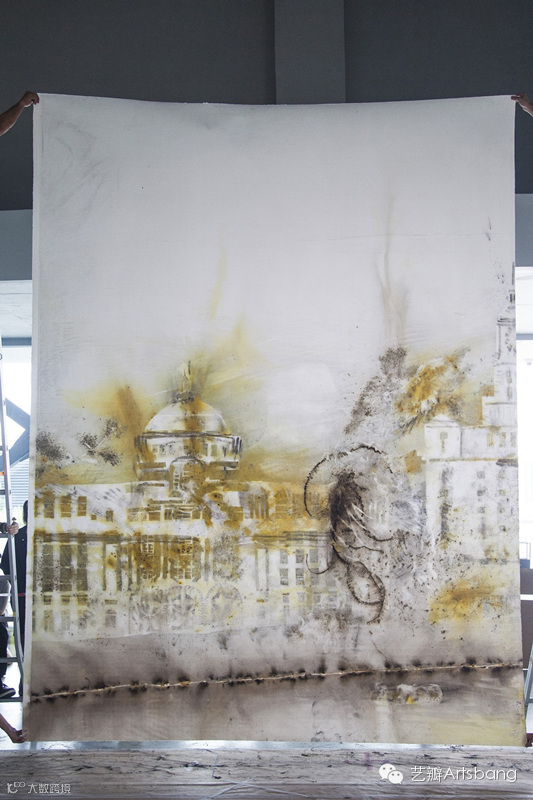 点火之前,蔡国强向现场观众解释作品的用意:“人类离开地球几百年后,外滩会变成什么样?这是我在这幅作品中想表现的。”他随即点燃引线,两秒钟的火光之后,现场浓烟滚滚。略带遗憾的是,一条引线以及局部火药没有被点燃,蔡国强又进行了多次“补炸”。揭开纸板后,一片熟悉又陌生的外滩景象在浓烟中“幻化”而出。