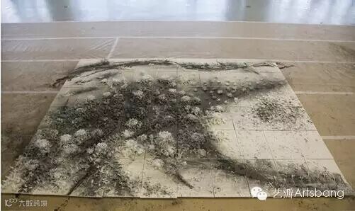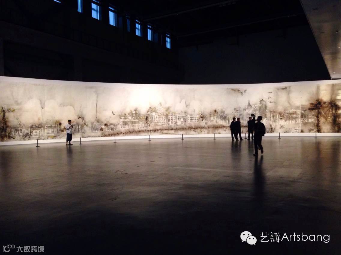 一楼大厅内首先让人注意的就是艺术家与志愿者共同“炸”出的火药草图装置《没有我们的外滩》。这件27米长、4米高的作品是此次展览中首次与公众见面。