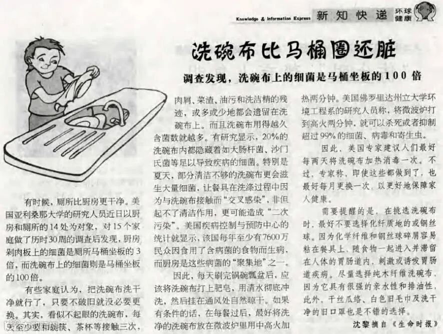 美国亚利桑那大学的研究人员以厨房和厕所的14处为对象,对15个家庭做了历时30周的调查后发现,厨房剁肉板上的细菌是厕所马桶坐板的3倍,而洗碗布上的细菌则是马桶坐板的100倍!